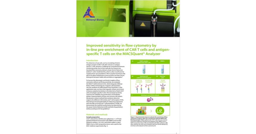 Conventional immune monitoring assays have difficulty detecting rare cells such as circulating chimeric antigen receptor (CAR) T cells or antigen-specific T cells. Standard flow cytometry has a lower limit of detection of 1 in 10,000, which is typically insufficient. Sample pre-treatment using magnetic cell separation can enhance analytical sensitivity and improve detection.