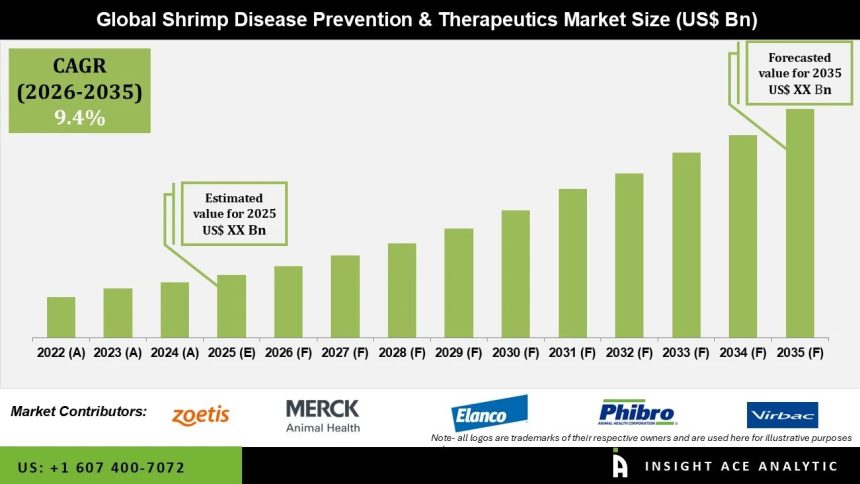 InsightAce Analytic Pvt. Ltd. announces the release of a market assessment report on the “Global Shrimp Disease Prevention & Therapeutics Market Size, Share & Trends Analysis Report By Shrimp Disease Prevention & Therapeutics Market Size, Share & Trends Analysis Distribution by Product Type (Disease Prevention (Probiotics & Microbial Products , Vaccines & Immunostimulants, Functional Health Feeds & Nutraceuticals, Biosecurity, Disinfectants & Diagnostics , Disease-Resistant Broodstock & Genetics), Therapeutics (Antibiotics, Antiparasitic & Antifungal Agents, Antivirals & Supportive Therapeutics, Chemical Disease-Control Treatments) By Disease Type (Viral Diseases, Bacterial Diseases, Parasitic & Microsporidian Diseases, Fungal & Opportunistic Pathogens), By End-user (Grow-Out Farms, Hatcheries & Nurseries, Integrated Farming & Feed Companies, Diagnostic Laboratories & Research Institute), Route of Administration (Oral, Water / Immersion / Bath Application, Injectable Delivery, Topical & External Application, Others),-Market Outlook And Industry Analysis 2035”